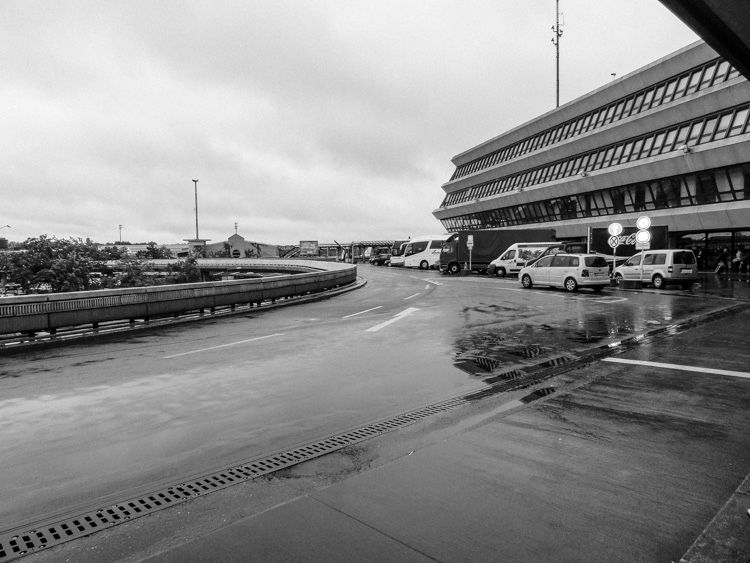 I had left Philly on Sunday morning, taking the MFL Subway to 30th Street to catch a bus to New York. I arrived there two hours later, taking yet another subway to Jamaica Station, where I caught the JFK Airtrain. A mere eight hours later, after soaring over the Atlantic, I touched down in Berlin, where I met with another bus, and another train, and, finally, I reached mein Haus. (While I was waiting for the bus at Tegel Airport in the mist, I snapped the photo above.) Although I had arrived, finally, at my house on Berliner Strasse in southwest central Berlin, I had to go to the Goethe Institute for reception and placement exams.